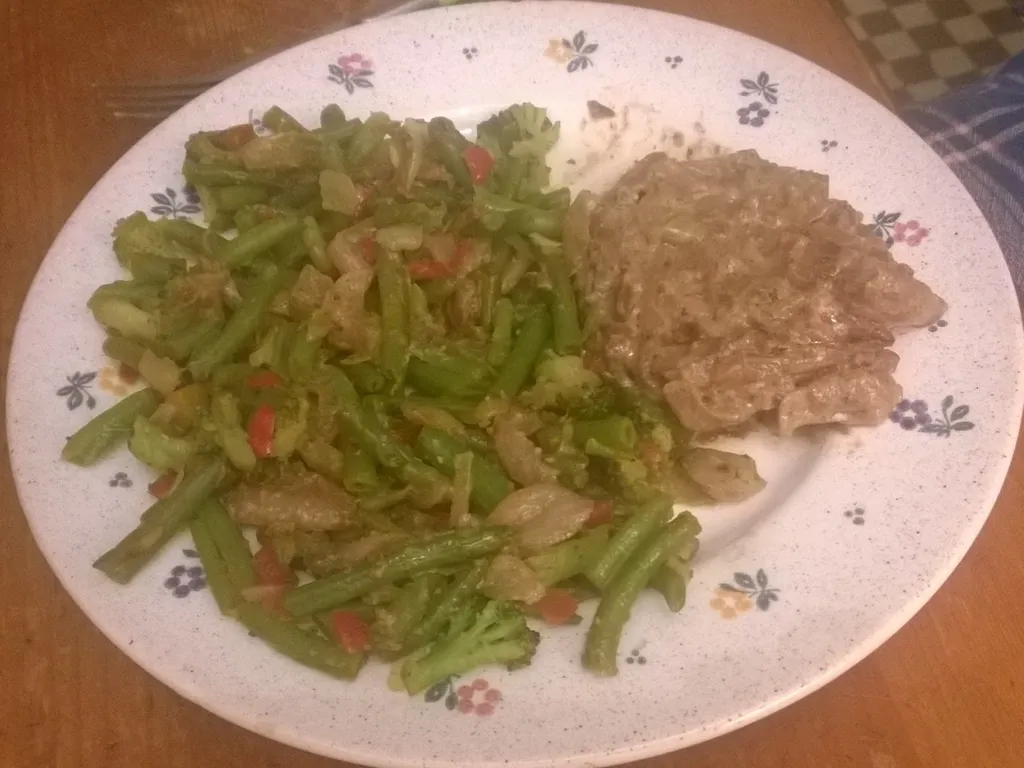 oignon, crème fraîche, miel, moutarde, steak, légumes