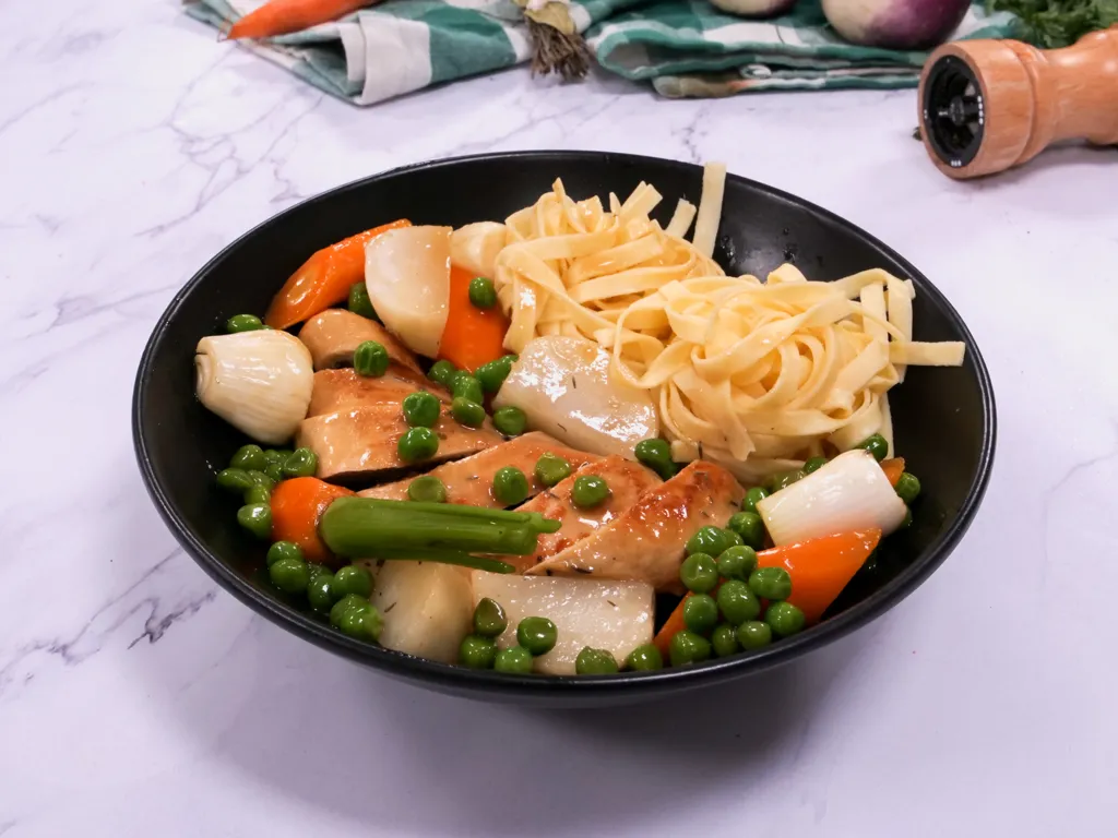 carotte, oignon, thym, fond de veau, poivre, blanc de poulet, navet, petits pois, cidre