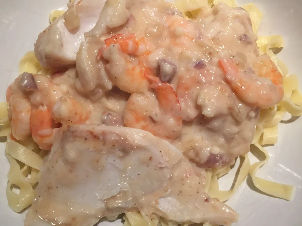 tagliatelles, oignon, citron, vin blanc, lieu noir, scampi, échalote, poisson, sauce blanche