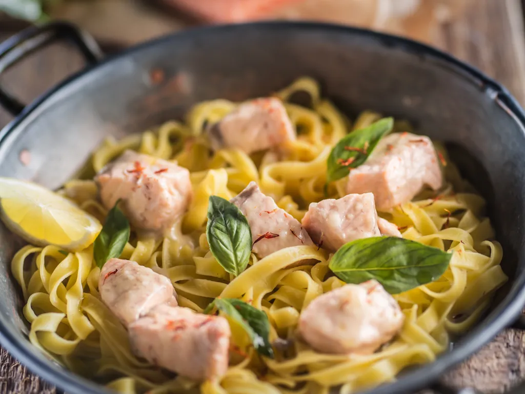 tagliatelles fraîches, citron, huile, poivre, sel, parmesan, saumon, crème fleurette, basilic frais