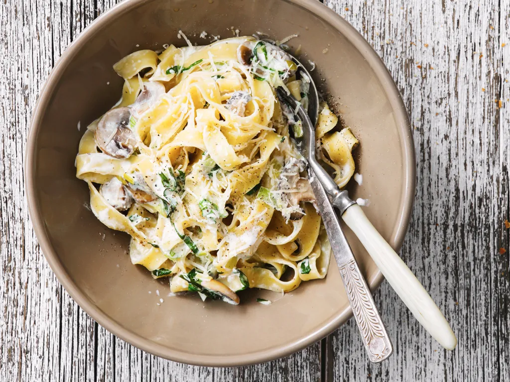 tagliatelles, champignon, vin, beurre, oignon, ail, poivre, sel, crème liquide, jambon blanc, jaune d'oeuf