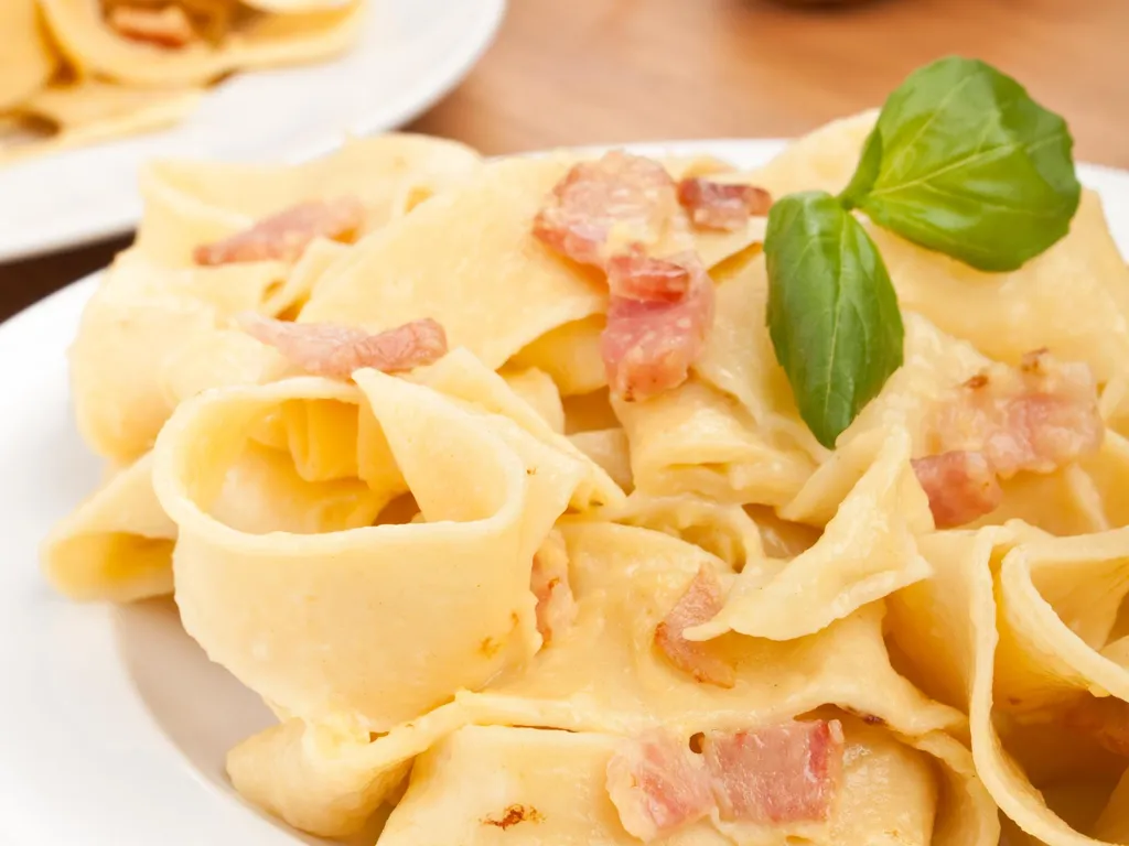 tagliatelles fraîches, oignon, ail, vin blanc, muscade, poivre, sel, lardons fumés, crème fraîche épaisse, oeuf