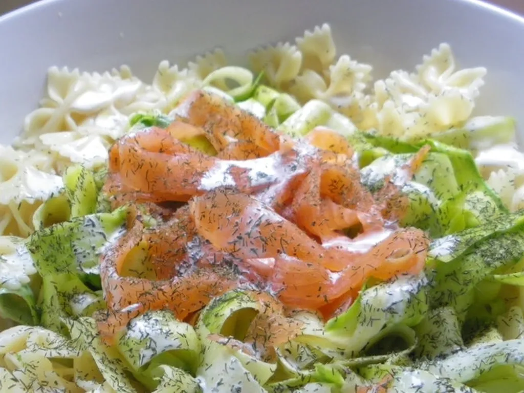 tagliatelles, courgette, ail, fromage râpé, sel, poivre, saumon fumé, crème fraîche liquide, crème fraîche épaisse