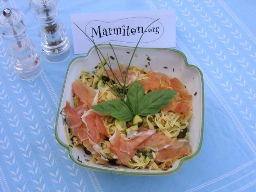 tagliatelles, courgette, tomate, ail, safran, basilic, persil, mozzarella, jambon de parme, olives noires, ciboulette