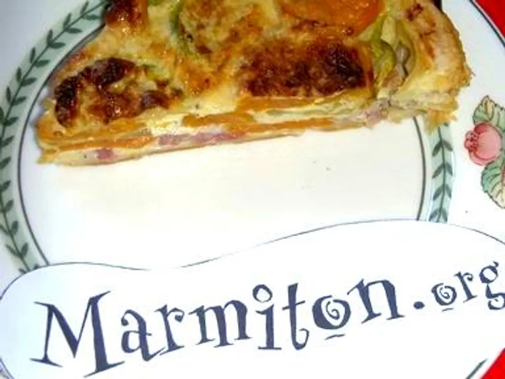 courgette, lardons, poivre, sel, piment d'espelette, herbes de provence, parmesan râpé, pâte brisée, patate douce, oeuf, crème fraîche liquide