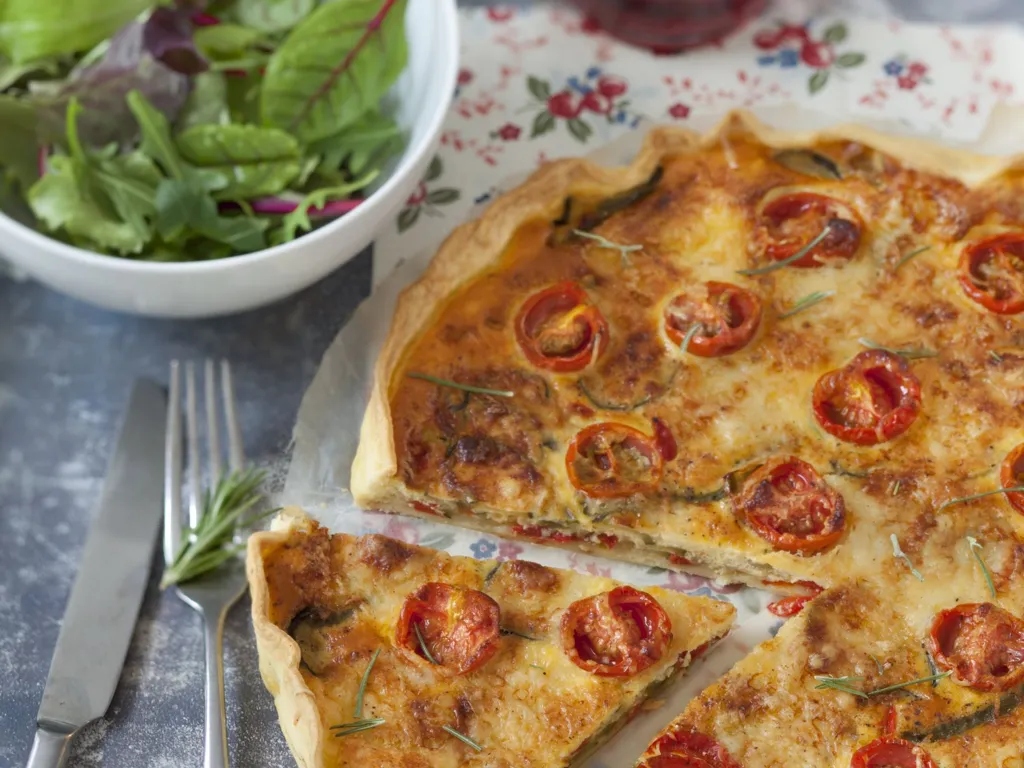 la tarte bien dorée est délicieuse avec une salade assaisonnée à l'huile d'olive.