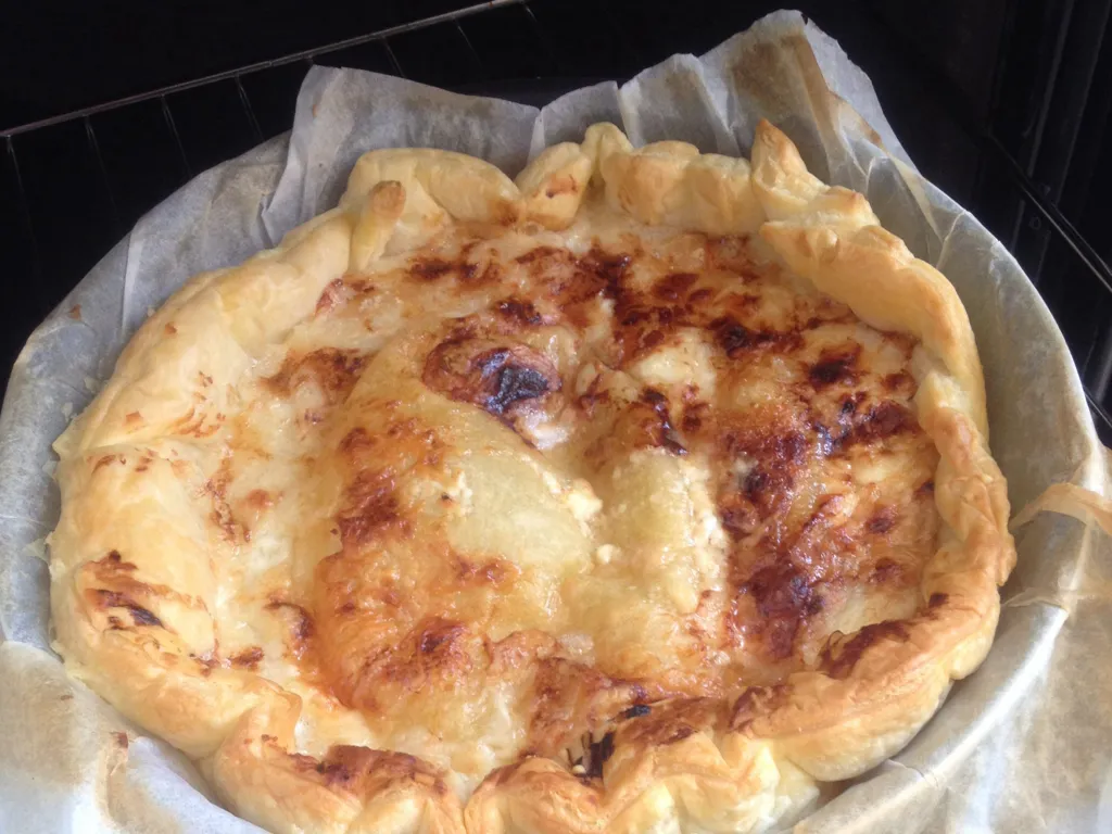 oignon, crème fraîche, comté, miel, poivre, sel, pâte feuilletée, bûche de chèvre