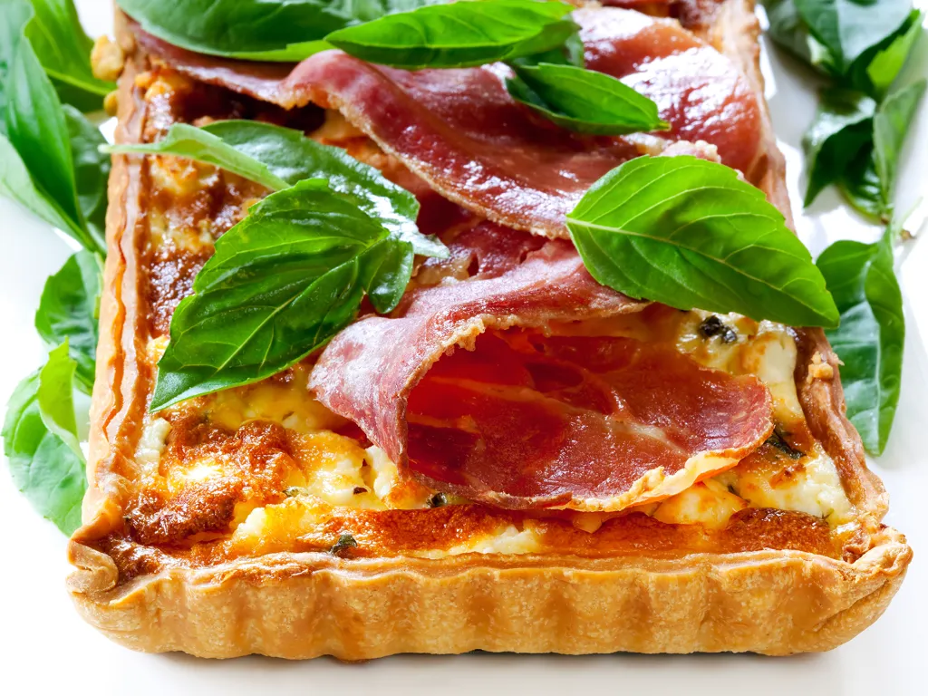 moutarde, tomate, oignon, gruyère râpé, origan, huile d'olive, pâte feuilletée, toastinette, jambon cru