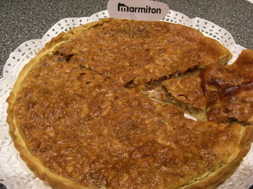 cerneau de noix, sucre, crème fraîche, maïzena, pâte sablée, oeuf, essence d'amande amère