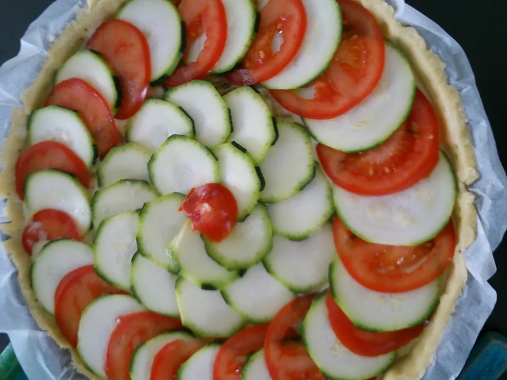 puis disposer la deuxième courgette coupée en rondelles et les tomates coupées en rondelles en intercalant un cercle de chaque.
