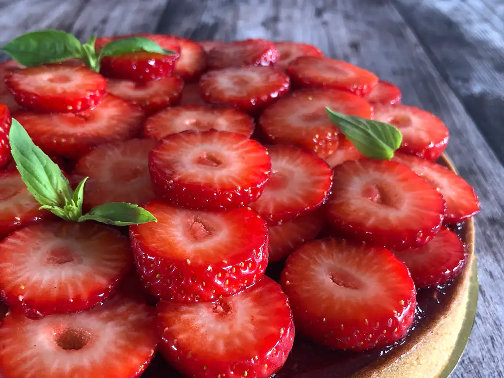 couper des fraises fraiches en rondelles et les disposer sur la tarte. les napper de nappage neutre pour les protéger et disposer quelques feuilles de basilic frais.