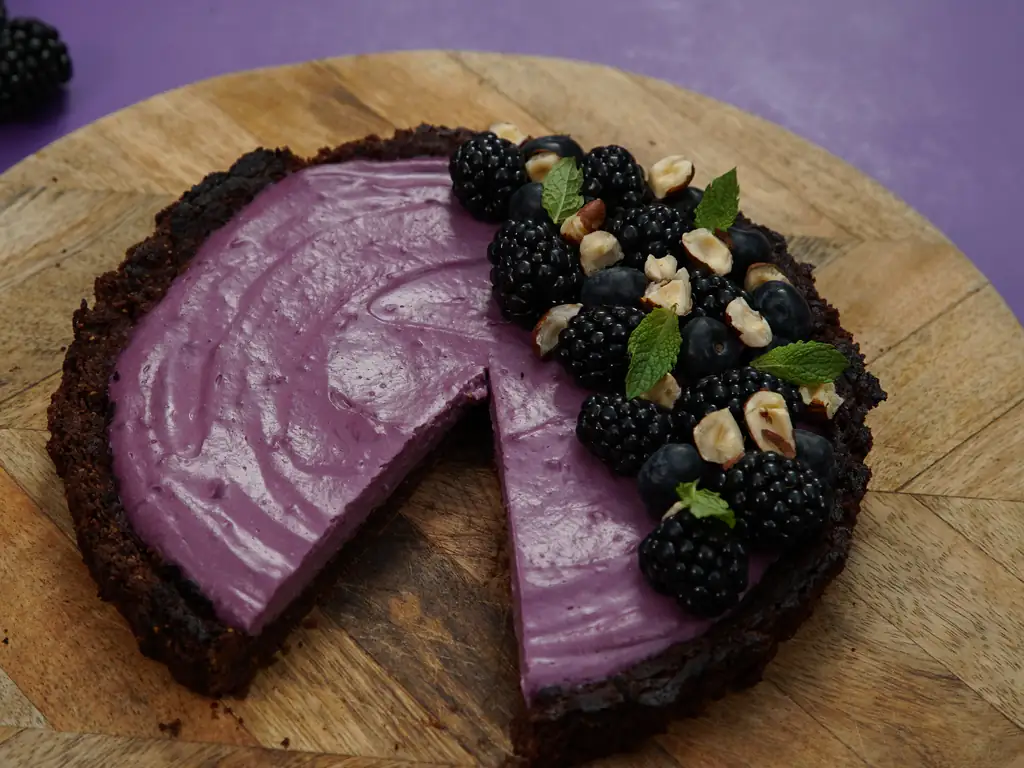 beurre, sucre, sel, extrait de vanille, noisettes, chocolat en poudre, farine, sucre, jus de citron, extrait de vanille, extrait de vanille, fécule de maïs, jaune d'oeuf, myrtilles, mûres, lait de coco