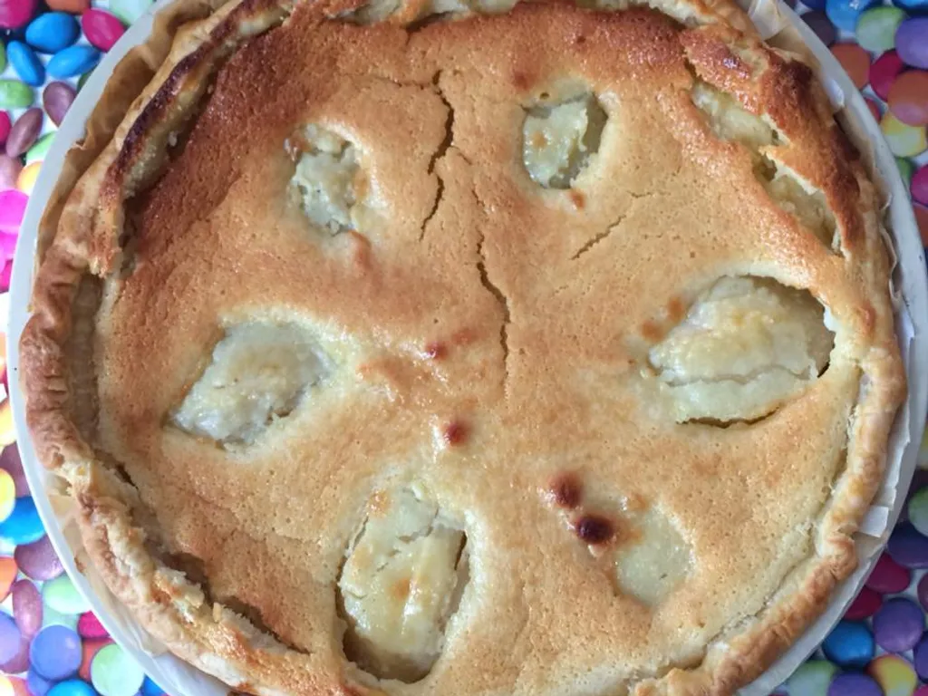 amandes en poudre, crème fraîche, sucre, pâte feuilletée, oeuf, poire