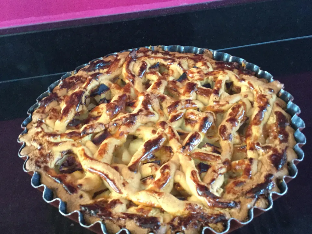 avec l’autre moitié de la pâte faire des boudins de 1 cm de diamètre, placez un boudin sur le rebord du plat et réalisez un quadrillage sur la garniture (maille de 4 sur 4 cm).