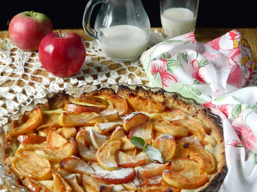 sucre, beurre, farine, vanille, sel, eau, pomme, rhum, confiture, sucre, vanille, eau, jaune d'oeuf