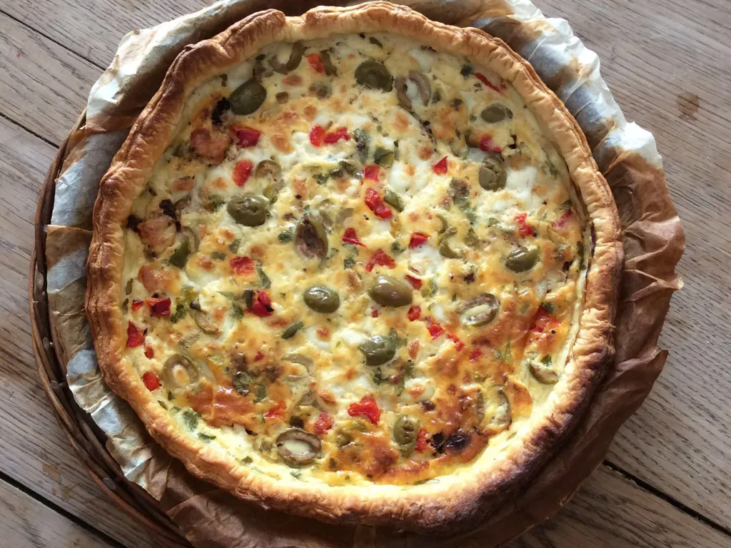tomate séchée à l'huile d'olive, poivron rouge, ail, moutarde, basilic, muscade, poivre, sel, pâte feuilletée, oeuf, crème fraîche épaisse, mozzarella, olives vertes, ciboulette