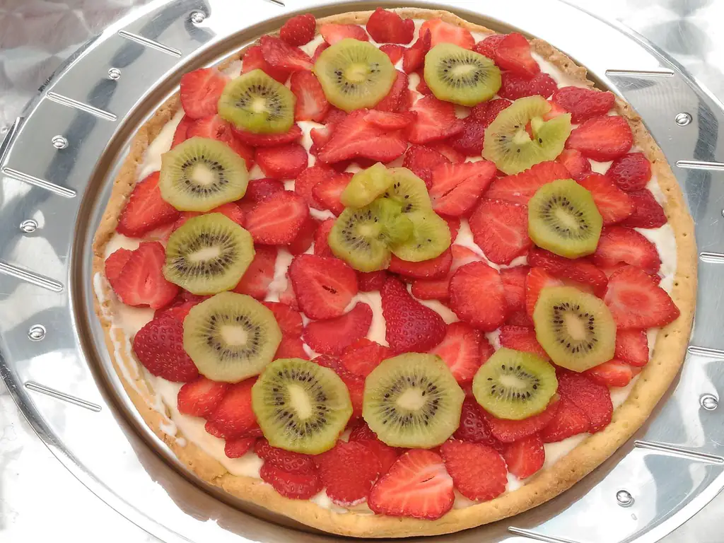 sucre en poudre, farine, lait, extrait de vanille, sucre vanillé, fraises, oeuf, crème liquide, kiwi, farine, beurre tendre, sucre, oeuf