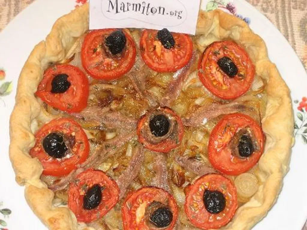oignon, tomate, huile, poivre, sel, thym, ail semoule, olives noires, anchois, farine, beurre