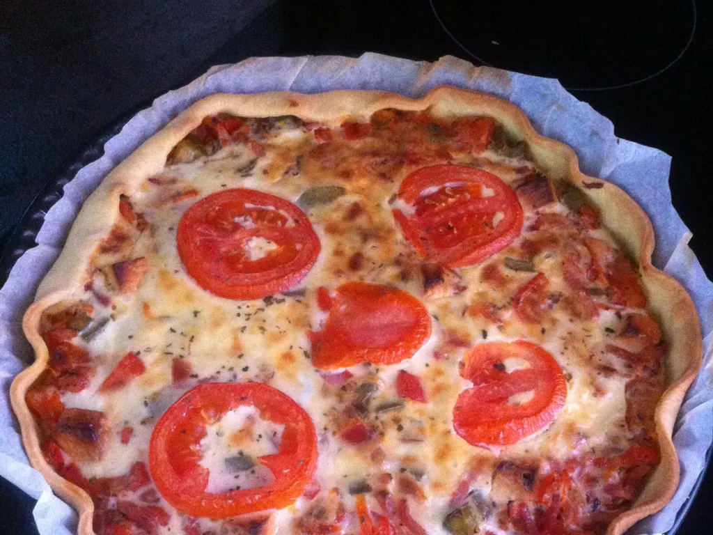 pâte brisée, poivron vert, poivron rouge, oignon, tomate, crème fraîche, oeuf, jaune d'oeuf