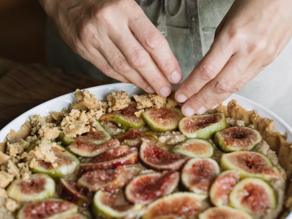 émietter le reste de pâte comme un crumble sur le dessus de la tarte.