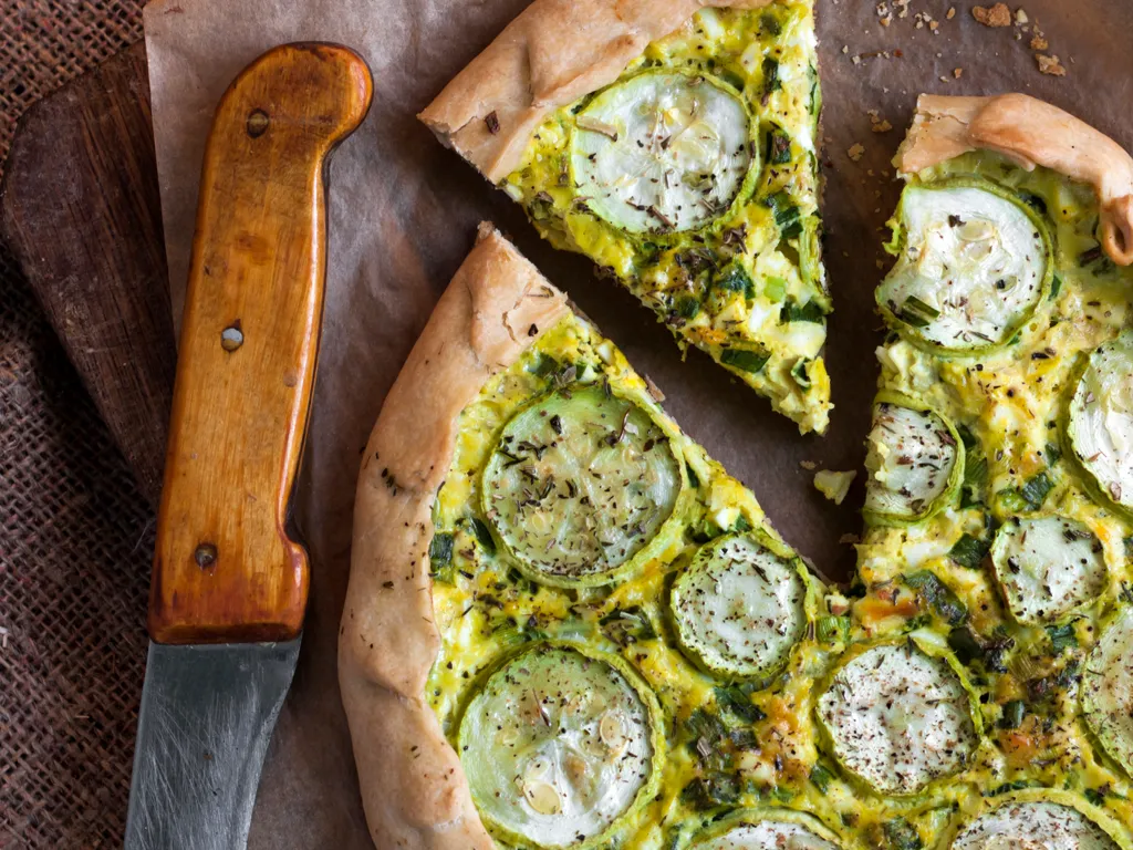 beurre, sel, courgette, farine complète, eau, oeuf, chèvre frais, bûche de chèvre, ciboulette, sel et poivre