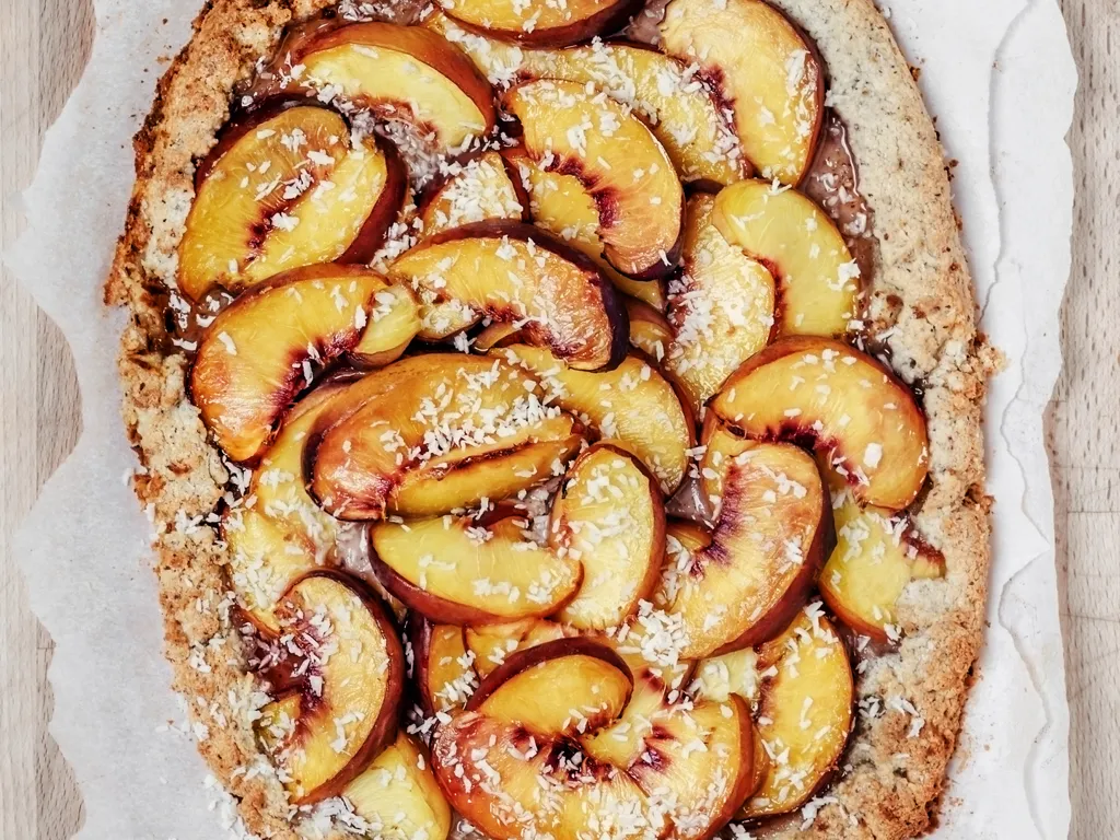 étaler la pâte, déposer les pêches dessus et saupoudrer la noix de coco râpée.