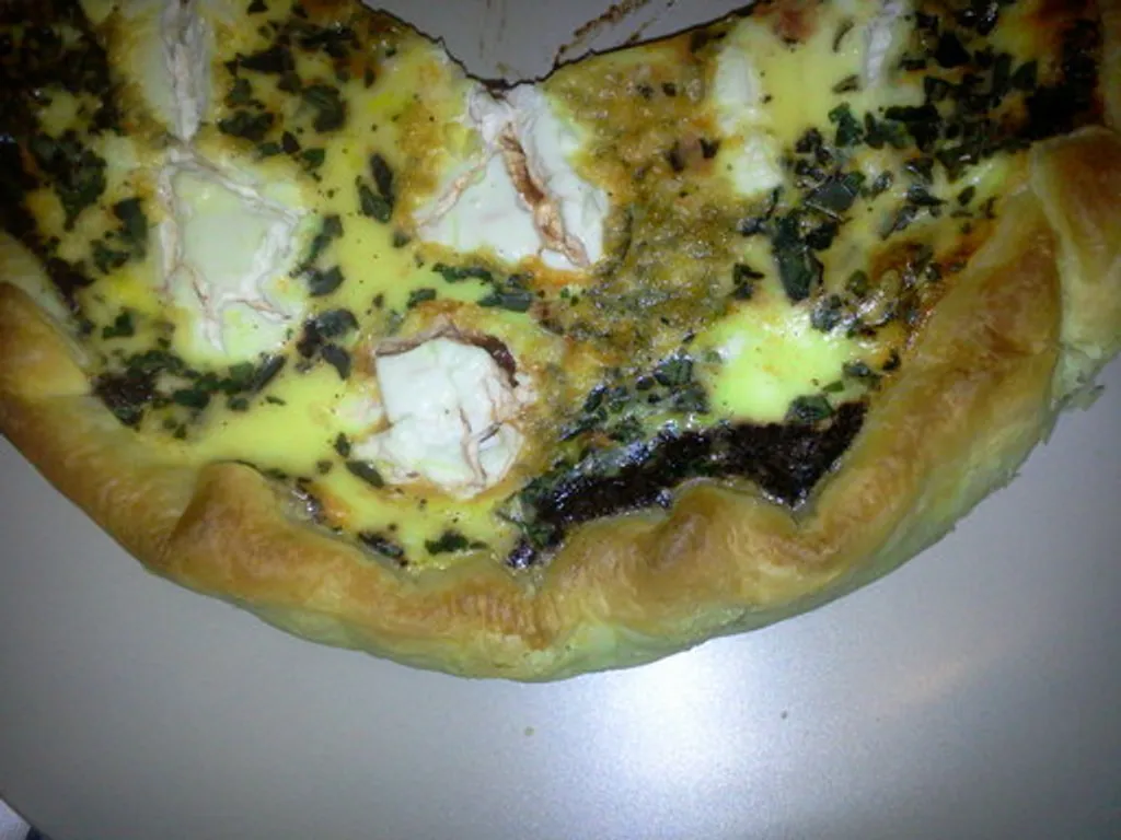 tapenade noire, lait, poivre, sel, pâte feuilletée, coulis de tomate, chèvre frais, basilic frais, oeuf