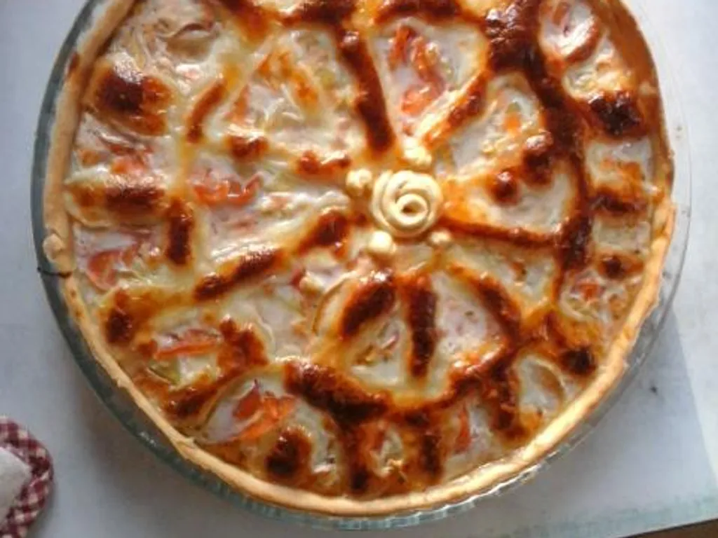 a présent, disposez les "rubans" de fromage en faisant des petits croisillons ou rosaces sur la tarte. mettez la tarte au four et laissez cuire entre 30 et 35 min. la pâte doit être cuite et la garniture pas trop liquide.