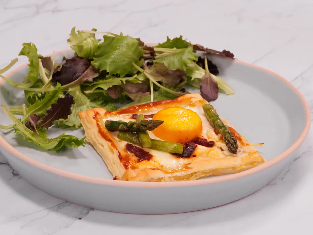 asperge verte, sel, poivre, huile d'olive, chorizo, persil, sel, poivre, pâte feuilletée, oeuf, crème fraîche épaisse