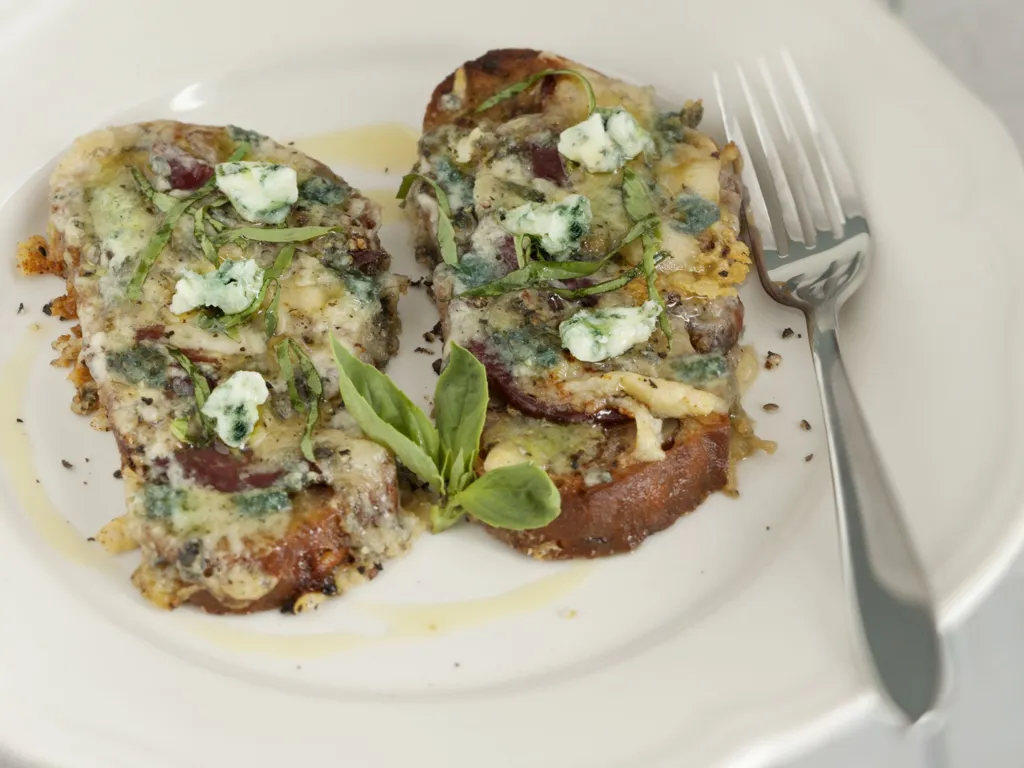 disposez les magrets sur une tranche de pain, ensuite le roquefort et saupoudrez de gruyère. faire cuire dans un appareil à croque-monsieur.