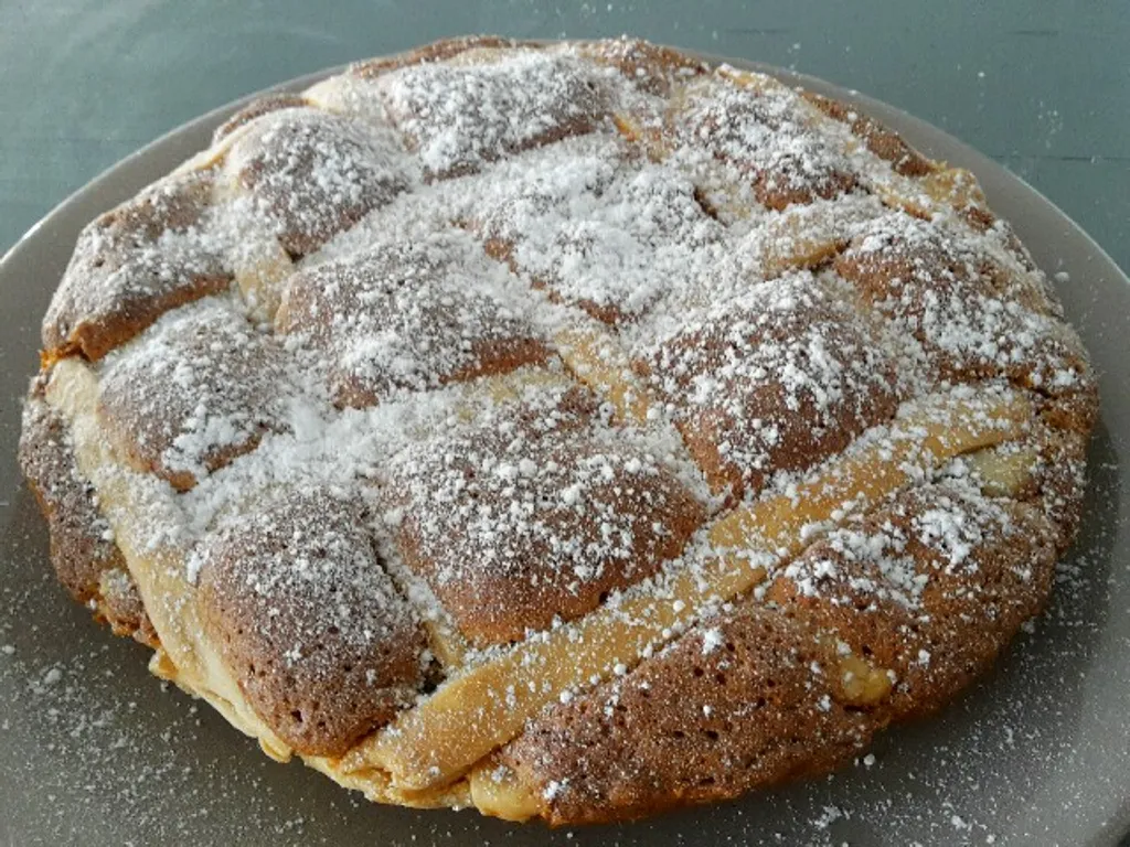 dans un moule à tarte, mettre la pâte brisée, coupez 1/3 de la pâte et gardez ce reste de pâte pour faire des bandes de décoration sur la tarte. enfournez 6 minutes.