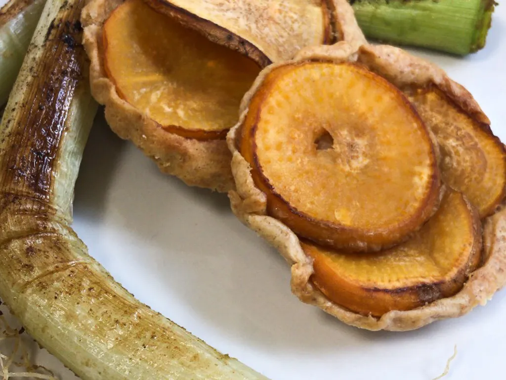 pour les tartelettes : beurrer des petits moules à tartes individuels, étaler une cuillère à café de miel au fond de chacun. déposer les rondelles de navets confits au fond du moule en les serrant bien. déposer une rondelle de pâte par-dessus, en ramassant avec les bords les rondelles de navet pour refermer la tartelette.