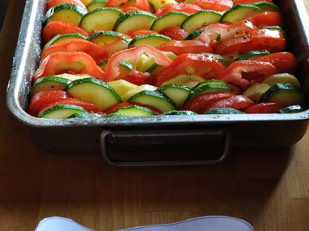 découper les légumes en rondelles de 2 à 3 mm d’épaisseur et les placer verticalement dans le plat en alternant une rangée de courgettes, puis de pommes de terre et de tomates.