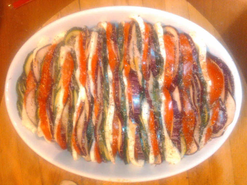 courgette, tomate, aubergine, basilic, ail, huile d'olive, sel, poivre, mozzarella