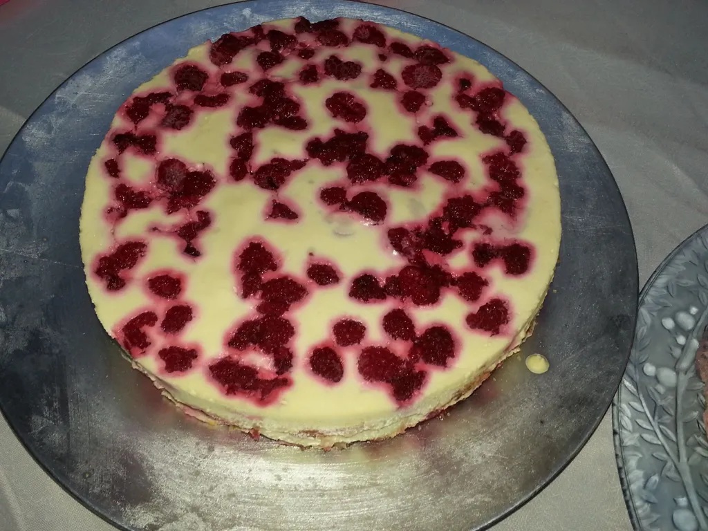 disposer les framboises sur la génoise, puis une première couche de mousse sur la génoise, puis une couche de biscuits trempés imbibés de jus de framboise et terminer par une couhe de mousse.