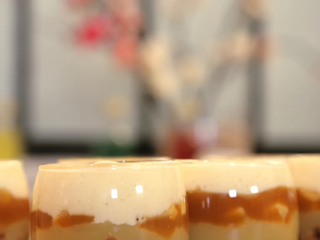 arroser les dés de pomme de caramel (une cueillère à soupe par verrine)