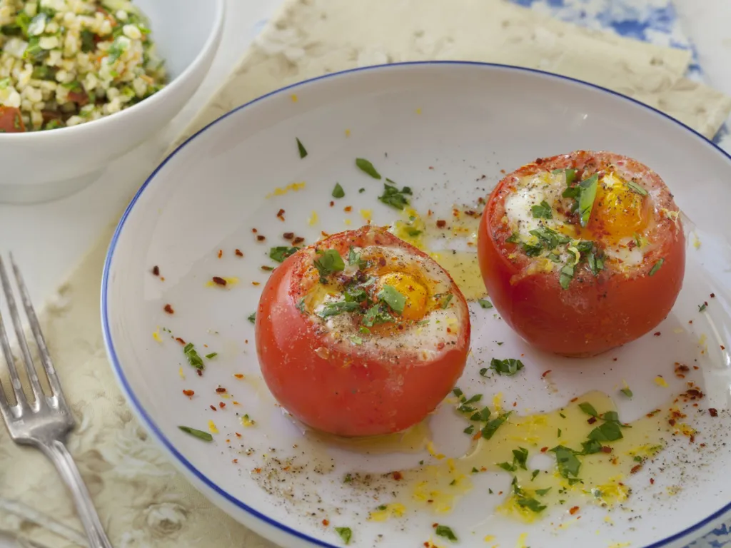 huiler le fond d'un plat, y disposer les tomates, casser un oeuf dans chacune d'elles.