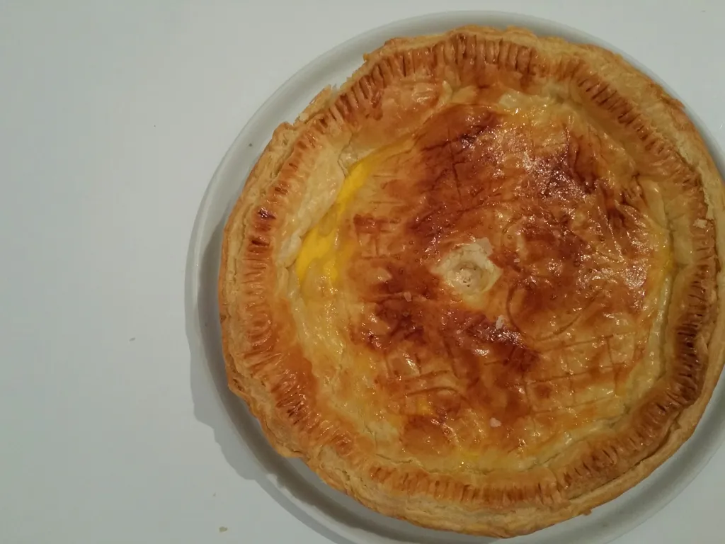 etaler la deuxième pâte sur la préparation et souder les deux bord avec les doigts. passer le jaune d'oeuf battu au pinceau sur la pâte. faire un trou au milieu pour éviter qu'elle ne gonfle lors de la cuisson.