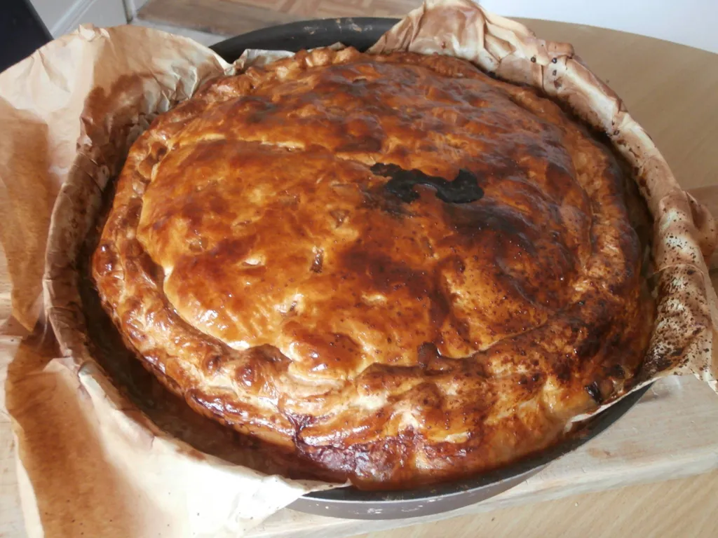 étaler la farce sur votre pâte feuilletée puis couvrir votre tourte avec le restant de la pâte.