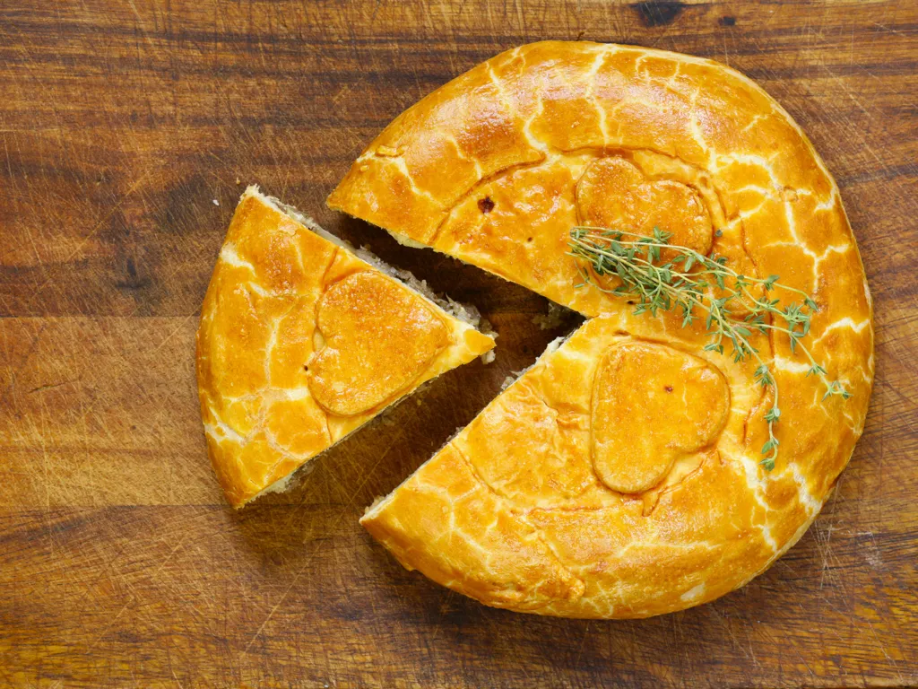 recouvrir avec la deuxième pâte à tarte, badigeonner avec un peu de lait ou du jaune d’œufs pour permettre à la tourte de dorer.