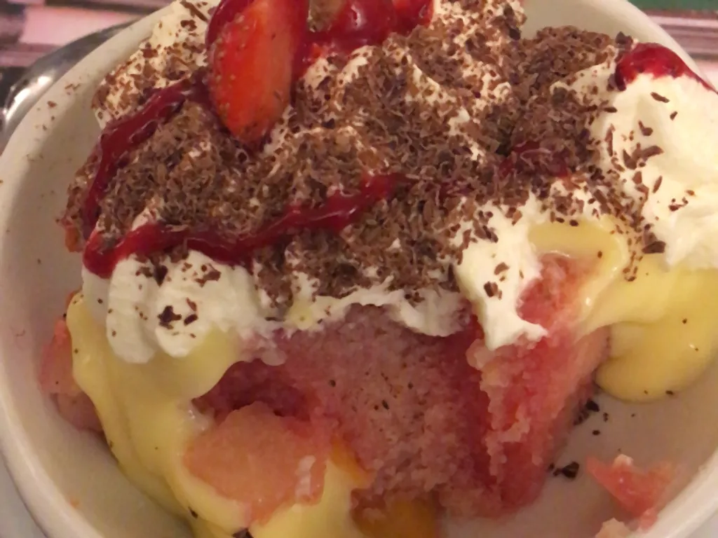 faire votre crème anglaise épaisse et laisser refroidir. avec un fouet y ajouter la crème épaisse petit à petit. couvrir votre trifle et laisser au froid jusqu'au moment de servir.