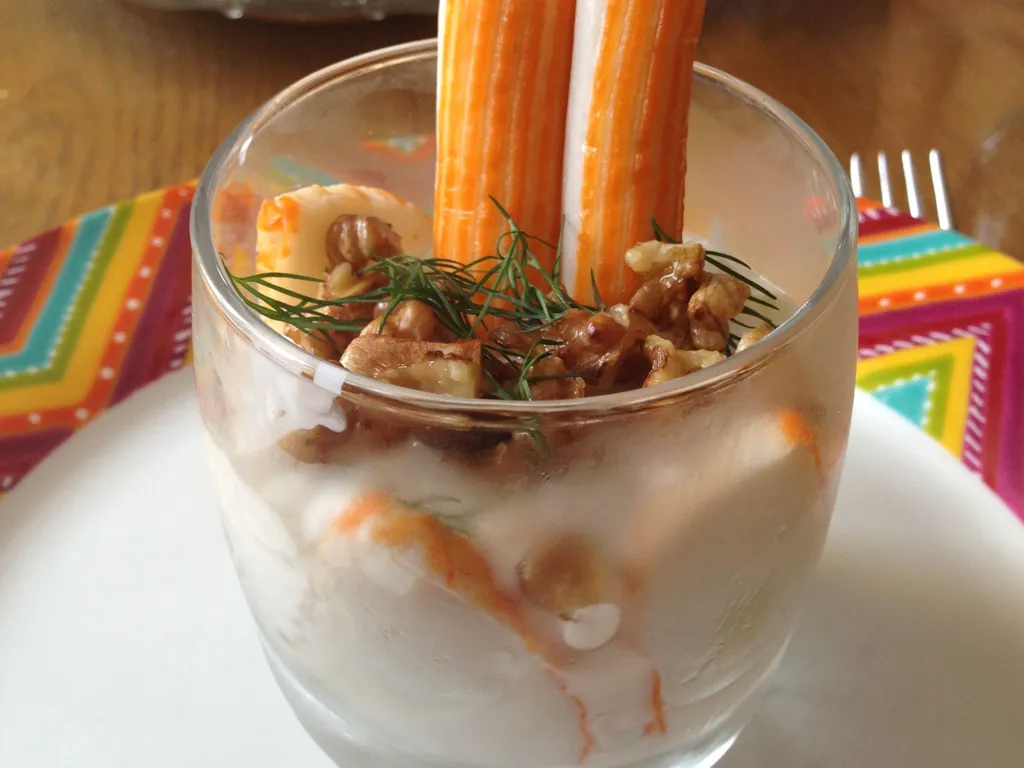 fromage blanc, aneth, carotte, céleri, poivre, sel, surimi, surimi, surimi, menthe, concombre, noix concassé
