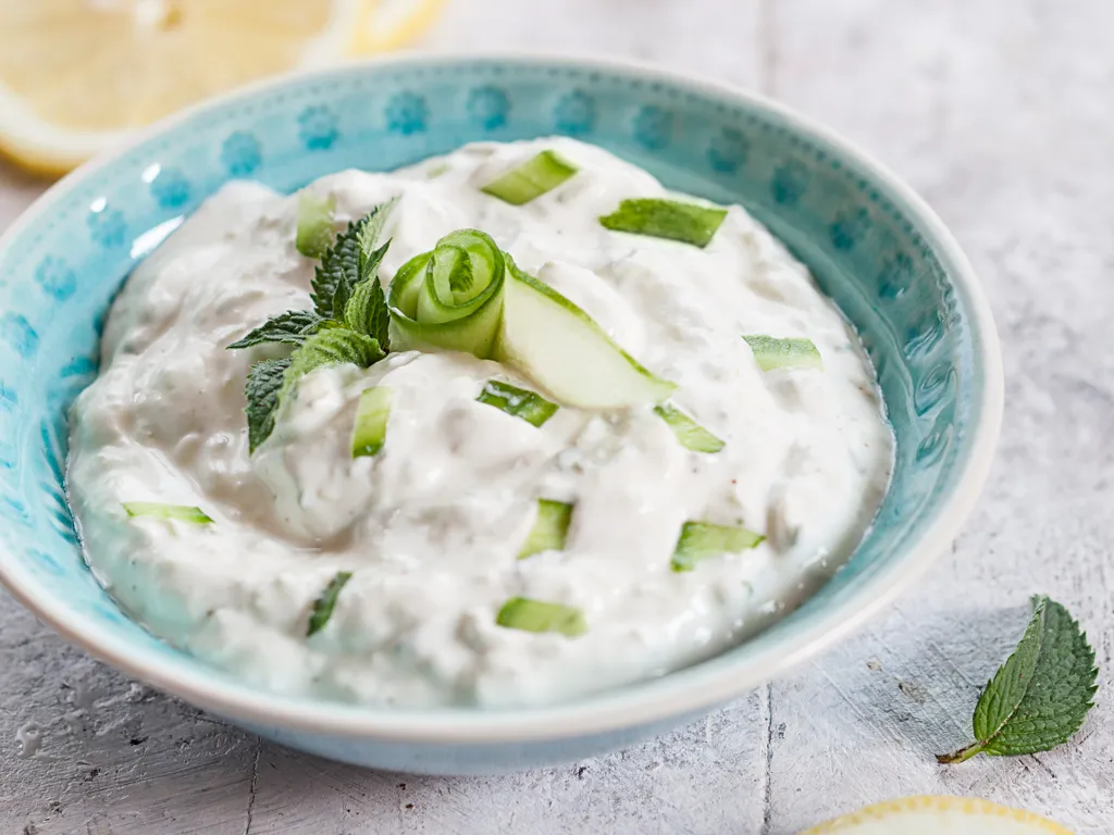 ail, sel, poivre, yaourt à la grecque, concombre, ciboulette