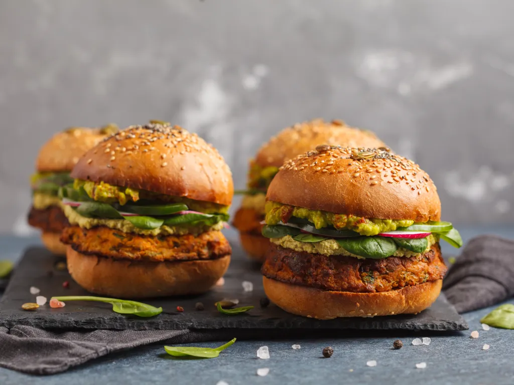 dressage des burgers. déposer un steak un soja sur 2 pains à burger, déposer une bonne couche de guacamole, des feuilles de mâches, des rondelles de radis et de concombre, une nouvelle couche de guacamole puis terminer avec le dessus des pains à burger.