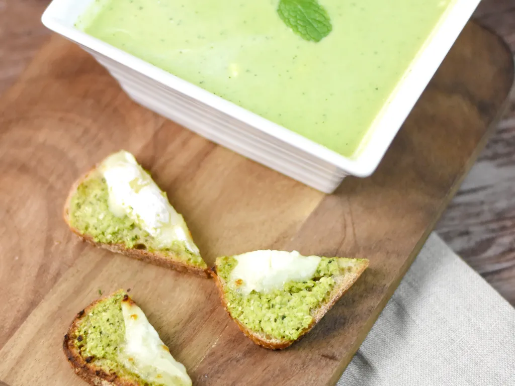 yaourt, ail, bouillon, sel, petits pois, menthe, pain complet, chèvre