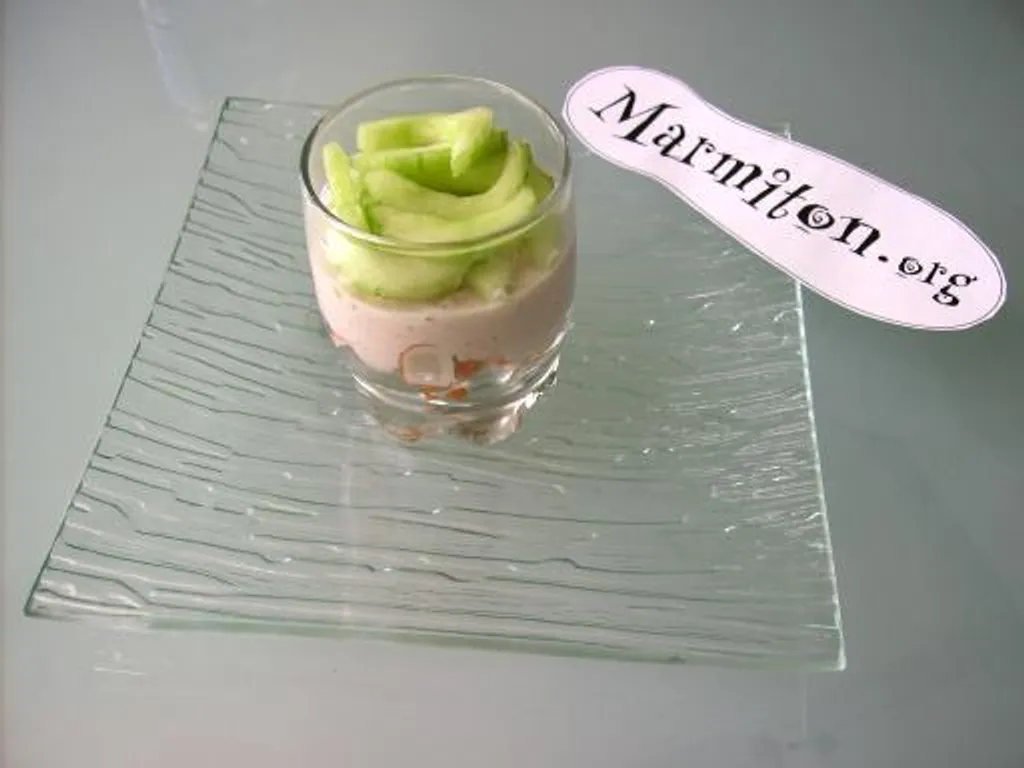 déposer la mousse de jambon au boursin dans les verrine et recouvrir de concombre (préalablement lavé et coupé en dés).