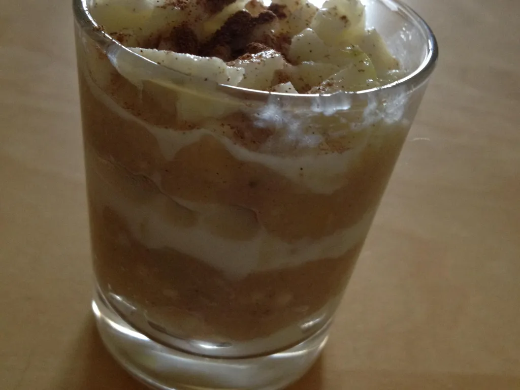 maintenant, alterner dans la verrine : pomme, banane, pomme, banane, pomme (cela dépend de la taille de vos verrines) et puis si vous le souhaitez, ajouter de la cannelle au dessus.