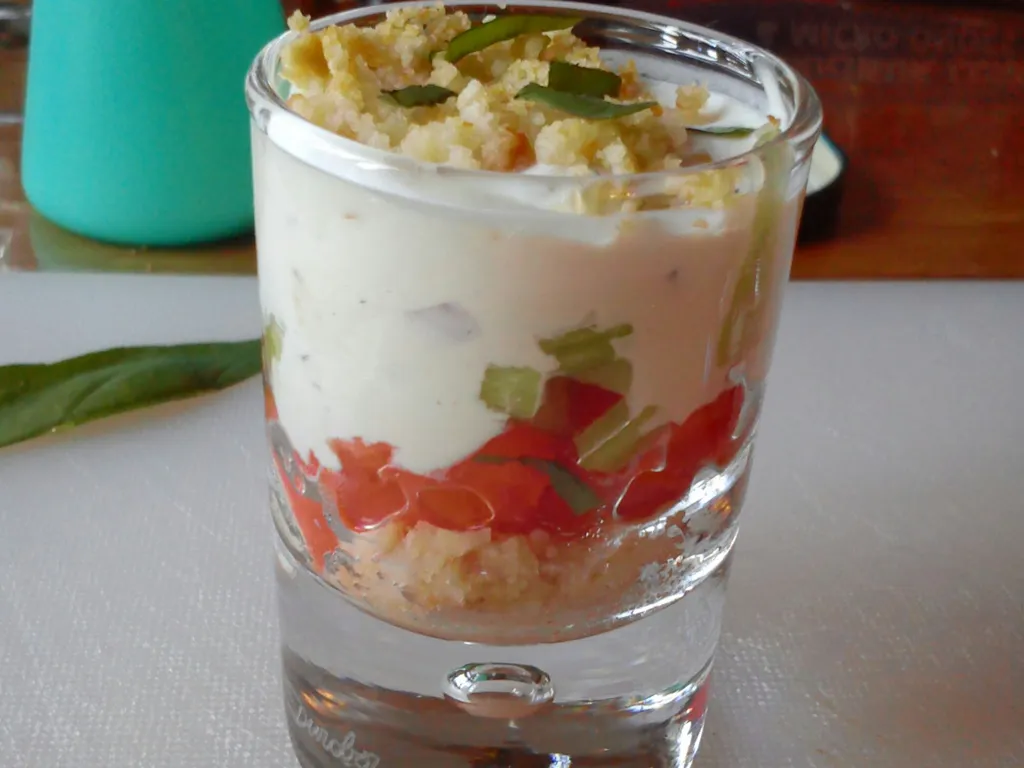crème fraîche, moutarde, vinaigre, sel, poivre, échalote, herbes, tomate, basilic, croûtons, concombre