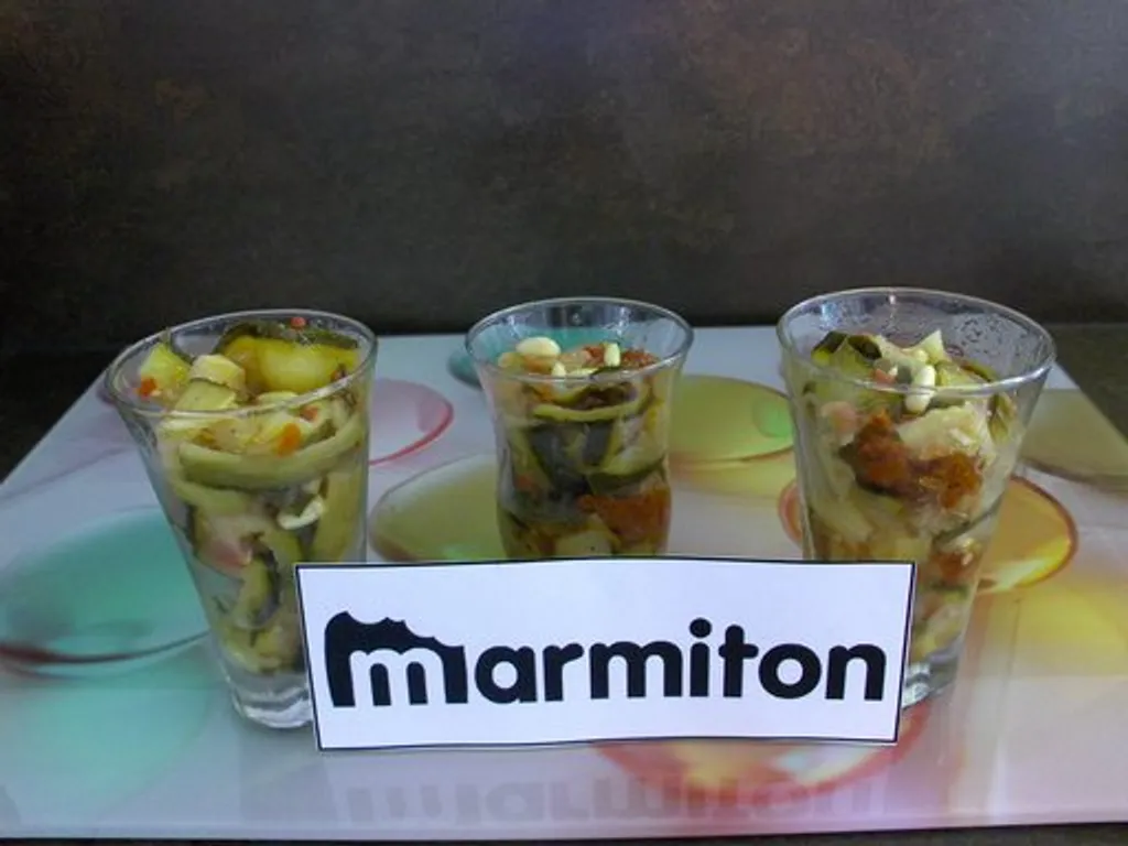 courgette, tomate séchée à l'huile d'olive, tomate, oignon, pignons, miel, vinaigre de vin, huile, gingembre, poivre, sel