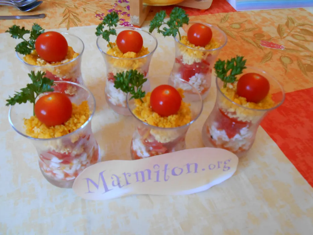 préparer les verrines, d'abord le blanc, puis les tomates et terminer par le jaune.